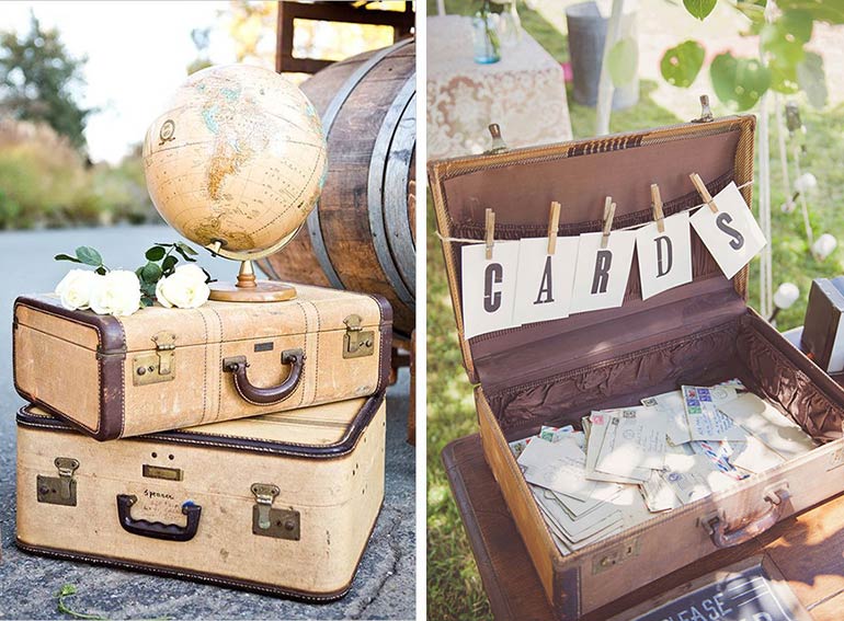 Für Karten und Geschenke, als Buffet- oder Sweettable-Dekoration oder auch einfach so eignen sich Vintage Koffer sehr gut. Habt Ihr ein Reisethema auch noch dabei? Umso besser! Darüber hinaus ist ein Vintage Koffer sehr praktisch, um nach der Hochzeit alle Karten nach Hause zu transportieren. Online gibt es hier sehr viel Auswahl, überlegt Euch aber zuerst welche Größe Ihr braucht!