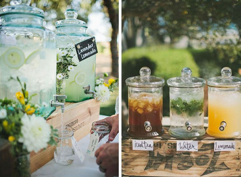 Ein herrliches Dekoelement und zugleich sehr wichtig, um Eure Gäste bei Sommertemperaturen hydriert & fit zu halten, ist ein schöner Dispenser – oder zu deutsch: Getränkespender. Inzwischen gibt es alle möglichen Größen und Formen der schönen Spender. Vergeßt dabei nicht, in einen der Spender ganz normales Wasser einzufüllen, denn nicht jeder Gast trinkt gerne süße Limonaden.