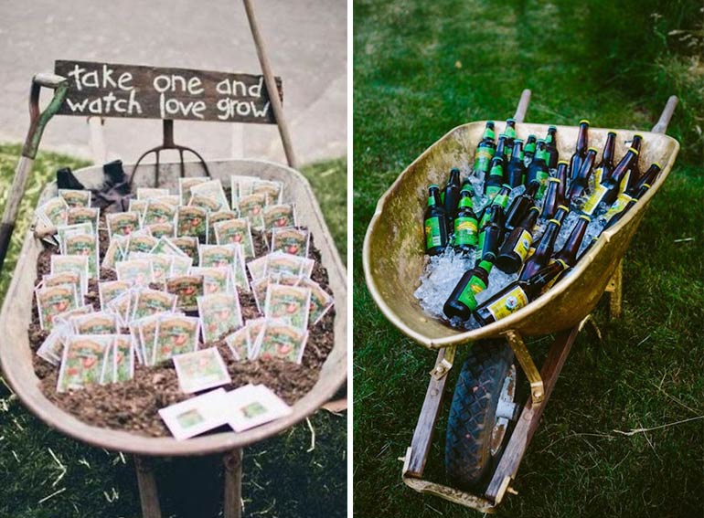 Als Halter für Eure Giveaways oder für Getränke eignen sich Schubkarren sehr gut, sie wirken originell und lockern das Dekokonzept sehr auf