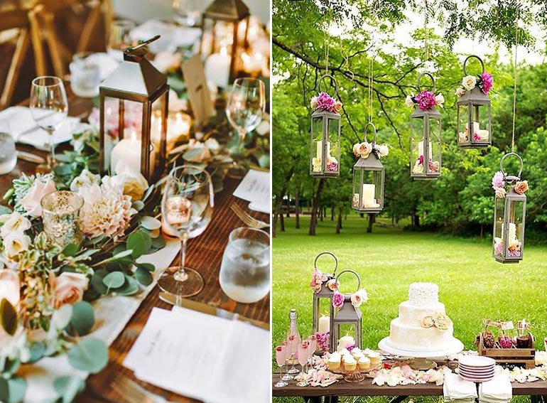 Laternen dürfen in unserer Aufzählung natürlich nicht fehlen! Sie sind bei einer Sommerhochzeit kaum wegzudenken! Windichter und Laternen sorgen bei Hochzeiten für ein wunderbar romantisches Flair und wirken ganz toll, wenn es langsam dünkler wird und sich der Abend und die Party nähert. Wunderschön finden wir sie, wenn sie in die Tischdeko eingebunden werden oder als Stylingelement von einem Ast hängend.