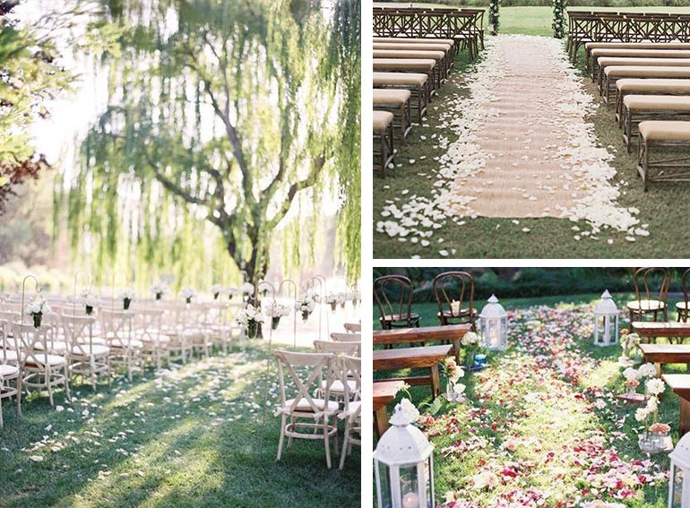 Mal ehrlich: Die meisten konzentrieren sich bei der Deko für die Trauung so stark auf die Stühle/Bänke links und rechts, dass sie dabei ganz auf den Mittelgang vergessen. Dabei kann man diesen mit einem ganz einfachen Trick als echten Hingucker gestalten! Einfach ein paar Rosenblätter streuen, in weiß oder Euren Hochzeitsfarben – reduziert oder opulent, je nach Eurem Geschmack. Wir finden, ein Läufer darunter passt auch noch wunderbar.