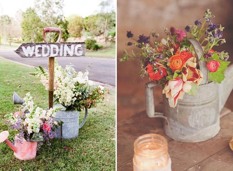 Gießkannen machen sich ebenfalls sehr gut für Blumen. Sie geben einer Sommerhochzeit einen richtig schön verspielten & romantsichen Eindruck. Man kann sie nicht nur am Boden sondern auch als Tischdeko/Centerpiece einsetzen.