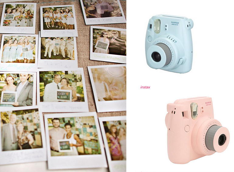 Das Bild unten ist von emmalinebride.com. Als Kameras empfehlen sie Modelle von Polaroid oder instax. Die blaue Instax im Bild gibt es auf Amazon