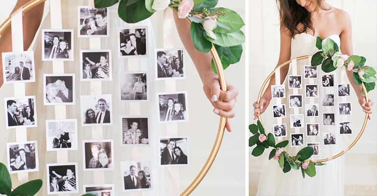 Ein wunderschönes Detail jeder Hochzeit sind Pärchenfotos des Brautpaares, vor allem wenn sie die Jahre der Beziehung darstellen. Für diesen schönen Goldrahmen, braucht Ihr nur diese Zutaten: Hula Hoop aus Holz in 80cm, Goldlack, weißes Stoffband, Floristendraht