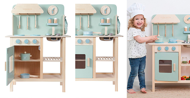 Eine schöne Alternative zur bekannten IKEA-Spielküche ist die kleine Little Dutch Kinderspielküche aus Holz. Die Küche ist preislich gleich! Sie besteht aus einem Ofen mit Tür, einem Regal, einer Spüle mit Wasserhahn, einer Uhr und einem Gasherd mit zwei Kochplatten. Das Kind kann sich direkt mit den passenden Küchenutensilien, Pfannen, Ofenhandschuhen, sowie mit einem Pfeffer- und Salzstreuer austoben. Die Drehknöpfe des Gasherdes und des Ofens machen Klickgeräusche, wenn man daran dreht.