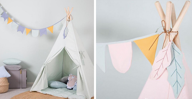 Das Tipizelt ist das ideale Versteck für kleine Abenteurer oder einfach zum Entspannen mit einem Buch. Das Zelt wird mit Zeltstangen, einem schönen Spielteppich, fröhlichen Federn und einer bunten Wimpelgirlande geliefert, um das Gesamtbild zu vervollständigen.
