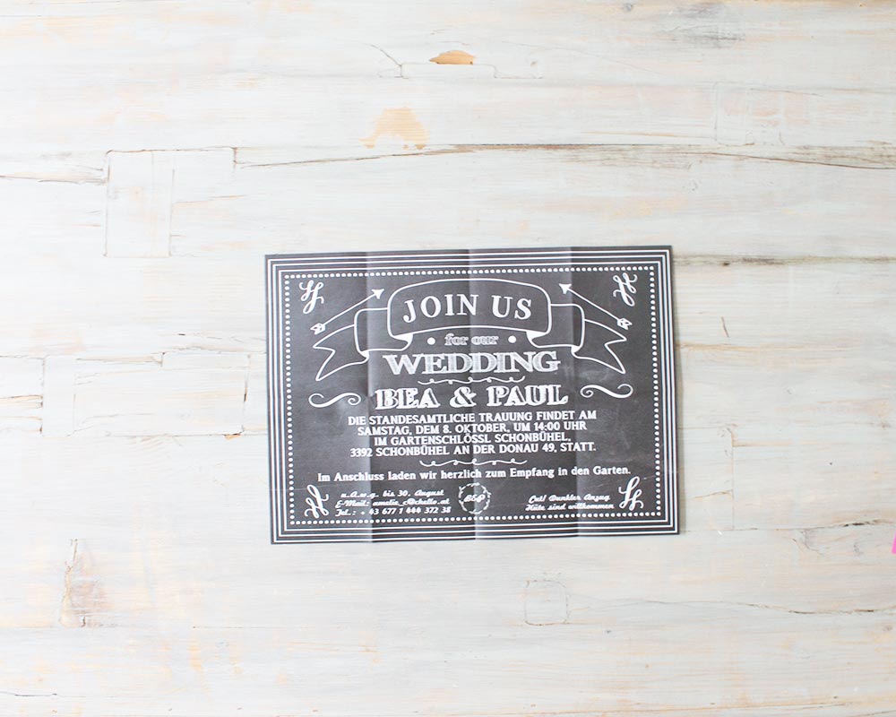 Kein Problem! Wir drucken Eure Einladungen in A3 und auf einem 90 gramm Papier. Dann könnt Ihr es ganze einfach zusammenfalten.
