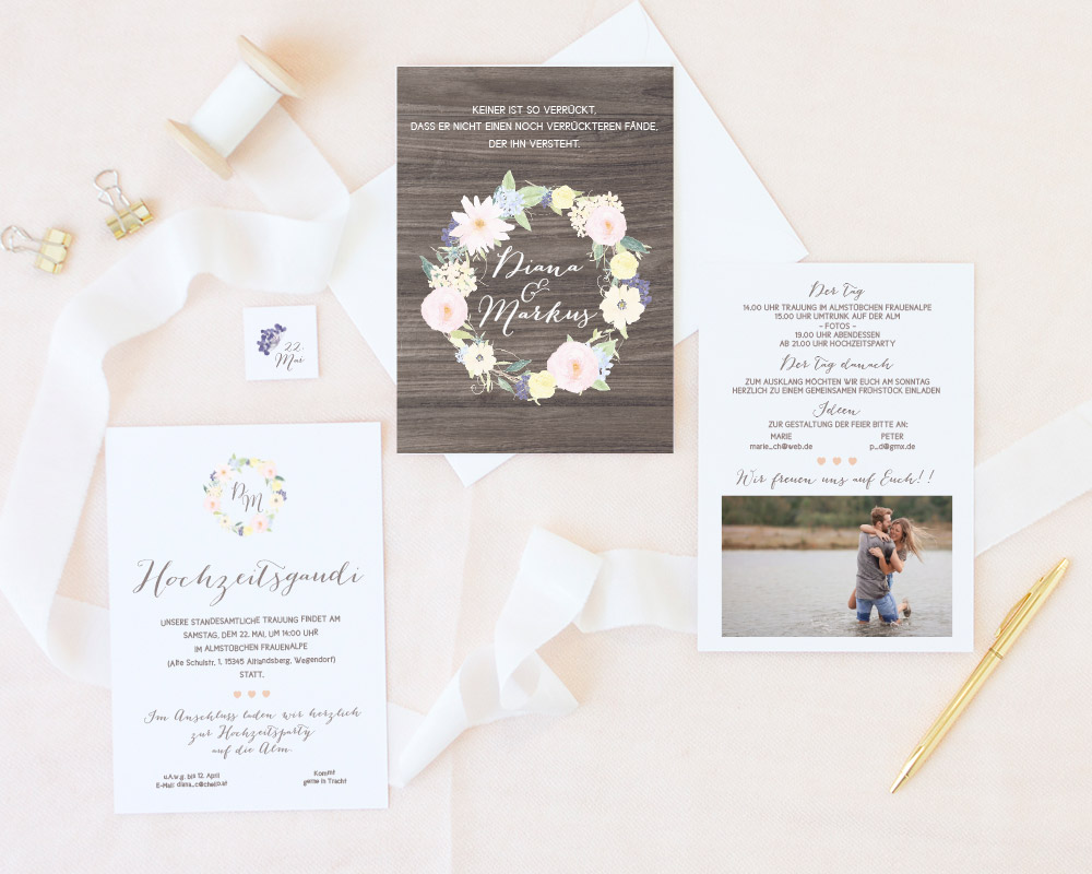 Für dieses Design (Kollektionsname) gibt es zusammenpassende Karten “Infos”, “Feier”, “Trauung” und ein “Tag”.