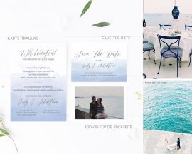 Wenn Ihr Euren Einladungen noch eine “Antwortkarte” für Eure Gäste hinzufügen möchtet –> legt einfach zusätzlich die “Save the Dates” dieser Kollektion in den Warenkorb und schreibt Euren Wunschtext ins Textfeld. Eure Antwortkarten haben dann das Format A6 und werden von uns im dazupassenden Design erstellt.