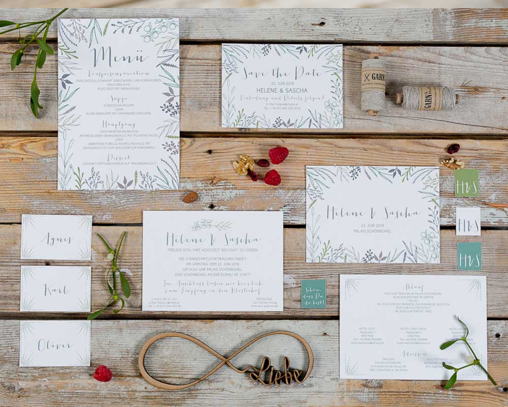 Für dieses Design (Kollektionsname) gibt es zusammenpassende Karten “Infos”, “Feier”, “Trauung” und ein “Tag”.