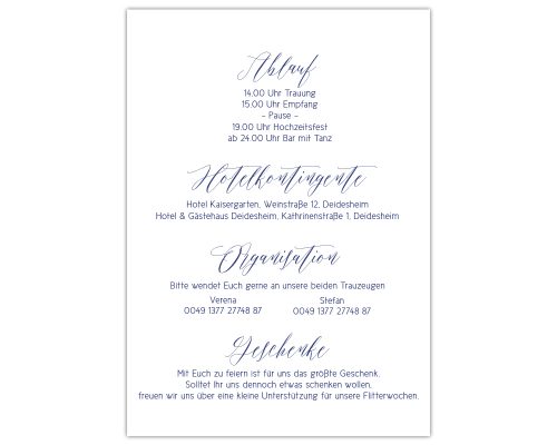 Für dieses Design (Kollektionsname) gibt es zusammenpassende Karten “Infos”, “Feier”, “Trauung” und ein “Tag”.