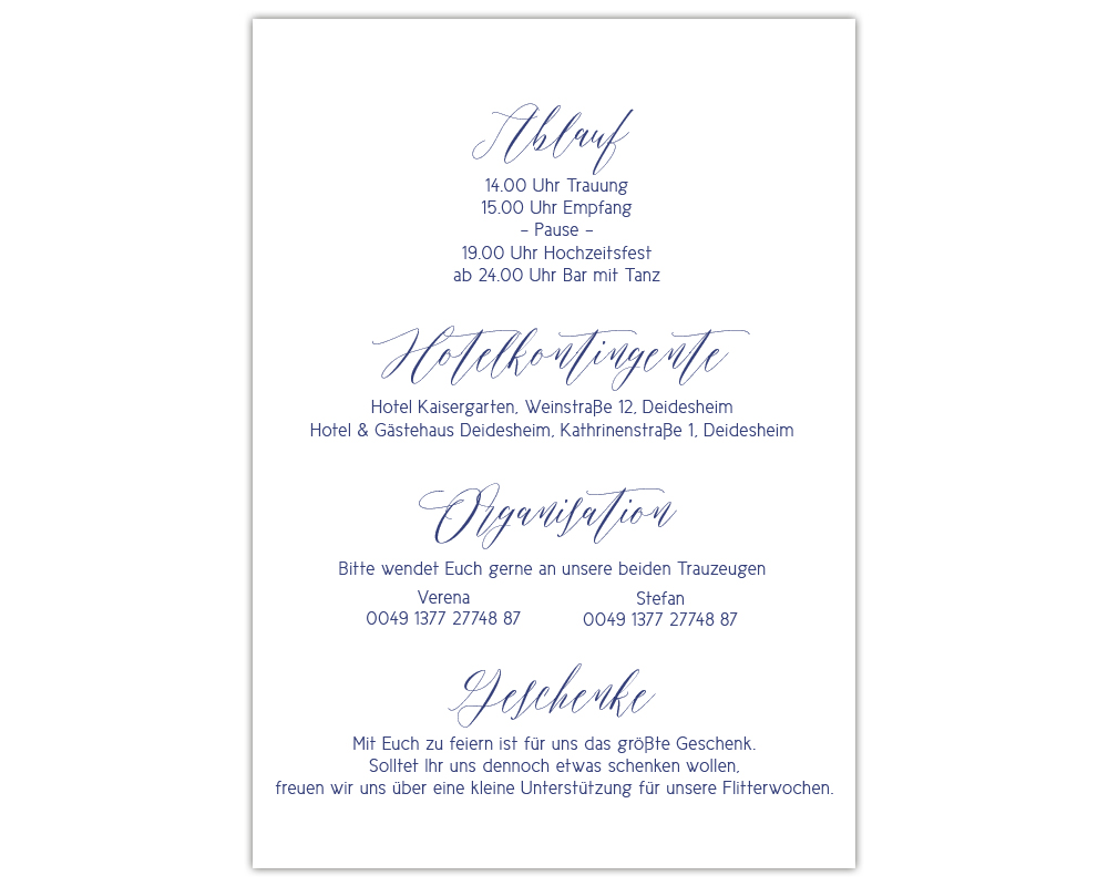 Kombiniert die Karte Infos mit den anderen Teilen der Hochzeitseinladung auf der rechten Seite –>