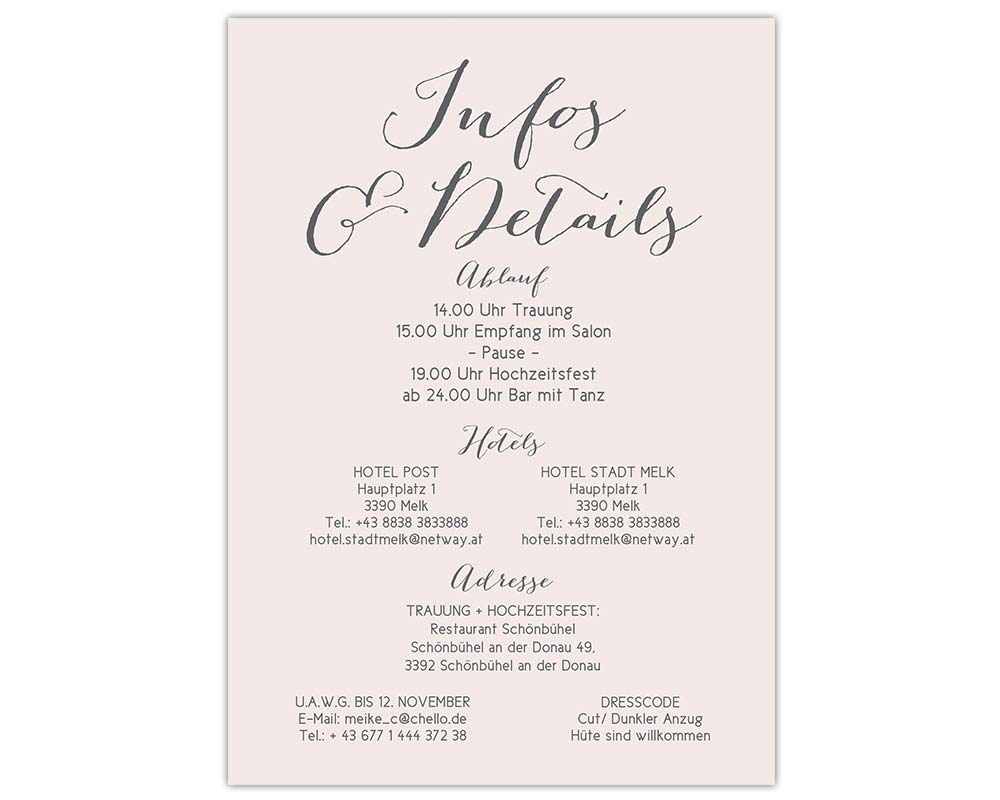 Kombiniert die Karte Infos mit den anderen Teilen der Hochzeitseinladung auf der rechten Seite –>