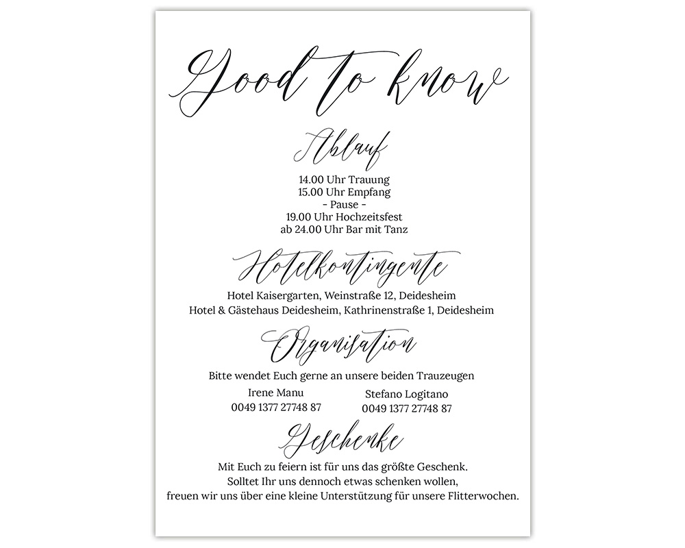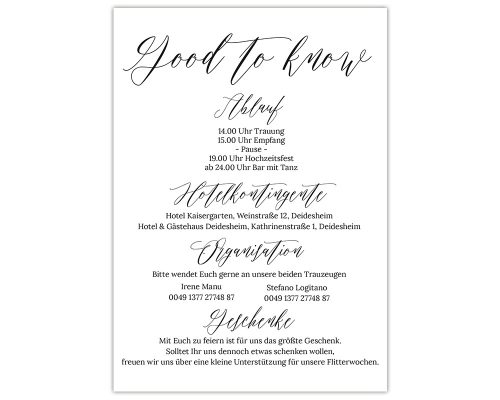 Kombiniert die Karte Infos mit den anderen Teilen der Hochzeitseinladung auf der rechten Seite –>