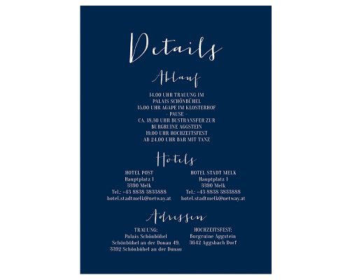 Kombiniert die Karte Infos mit den anderen Teilen der Hochzeitseinladung auf der rechten Seite –>