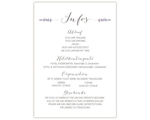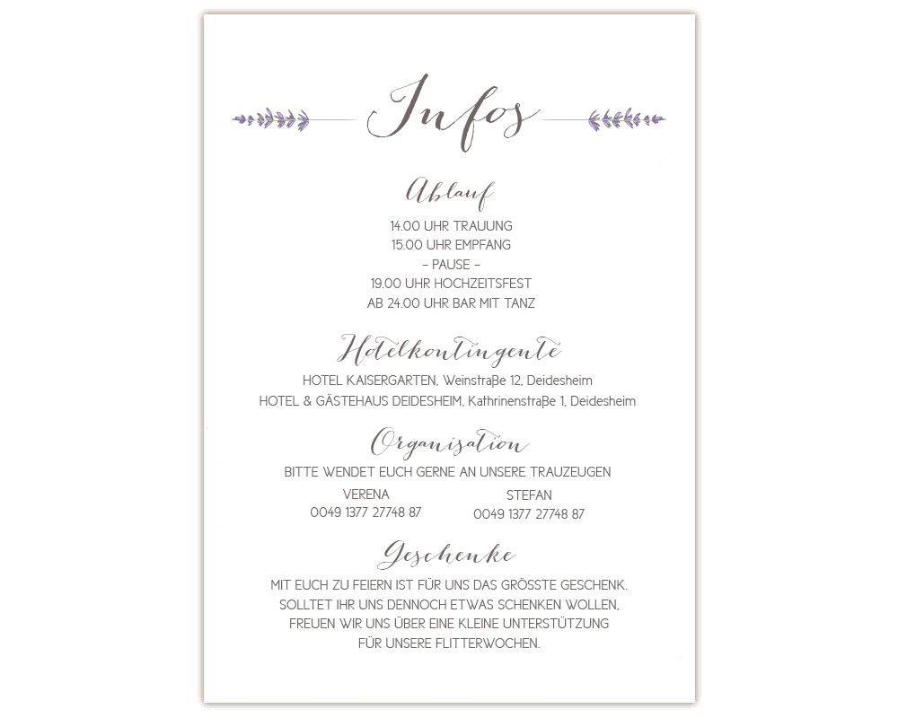 Kombiniert die Karte Infos mit den anderen Teilen der Hochzeitseinladung auf der rechten Seite –>