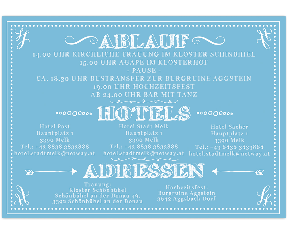 Kombiniert die Karte Infos mit den anderen Teilen der Hochzeitseinladung auf der rechten Seite –>