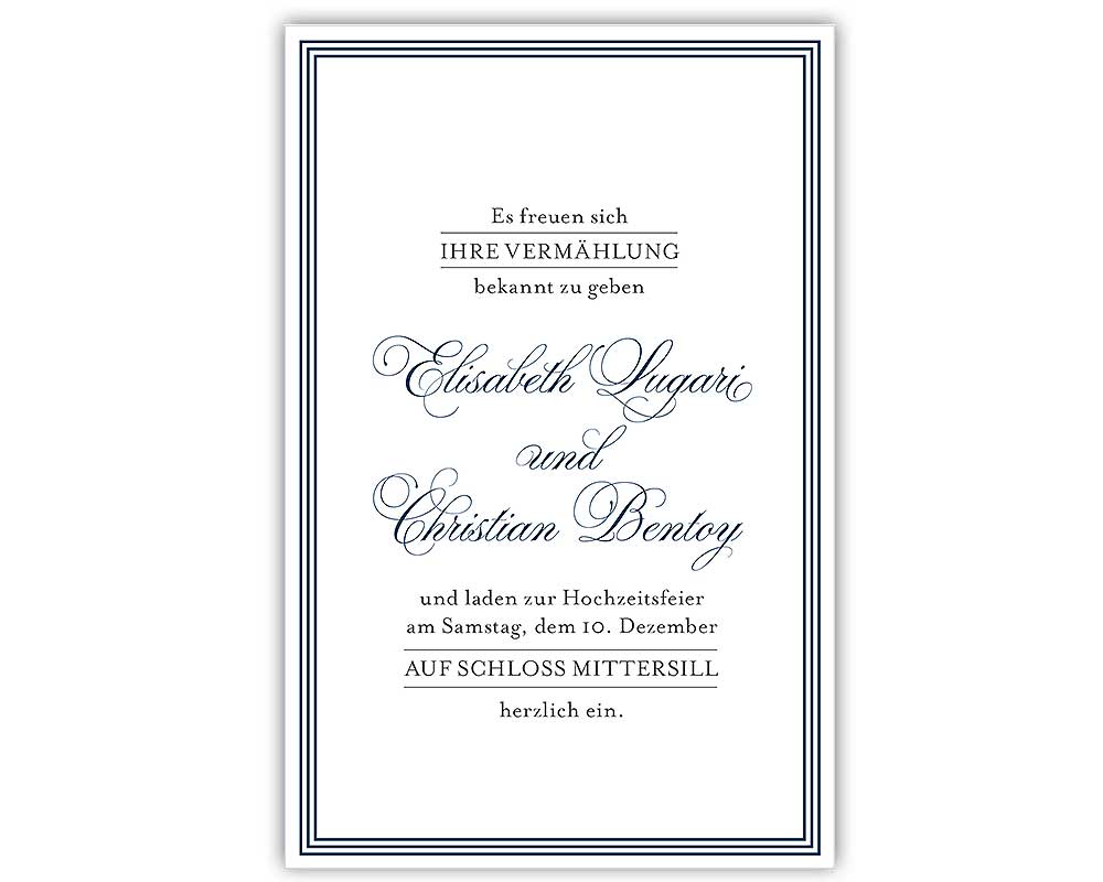 Für dieses Design (Kollektionsname) gibt es zusammenpassende Karten “Infos”, “Feier”, “Trauung” und ein “Tag”.